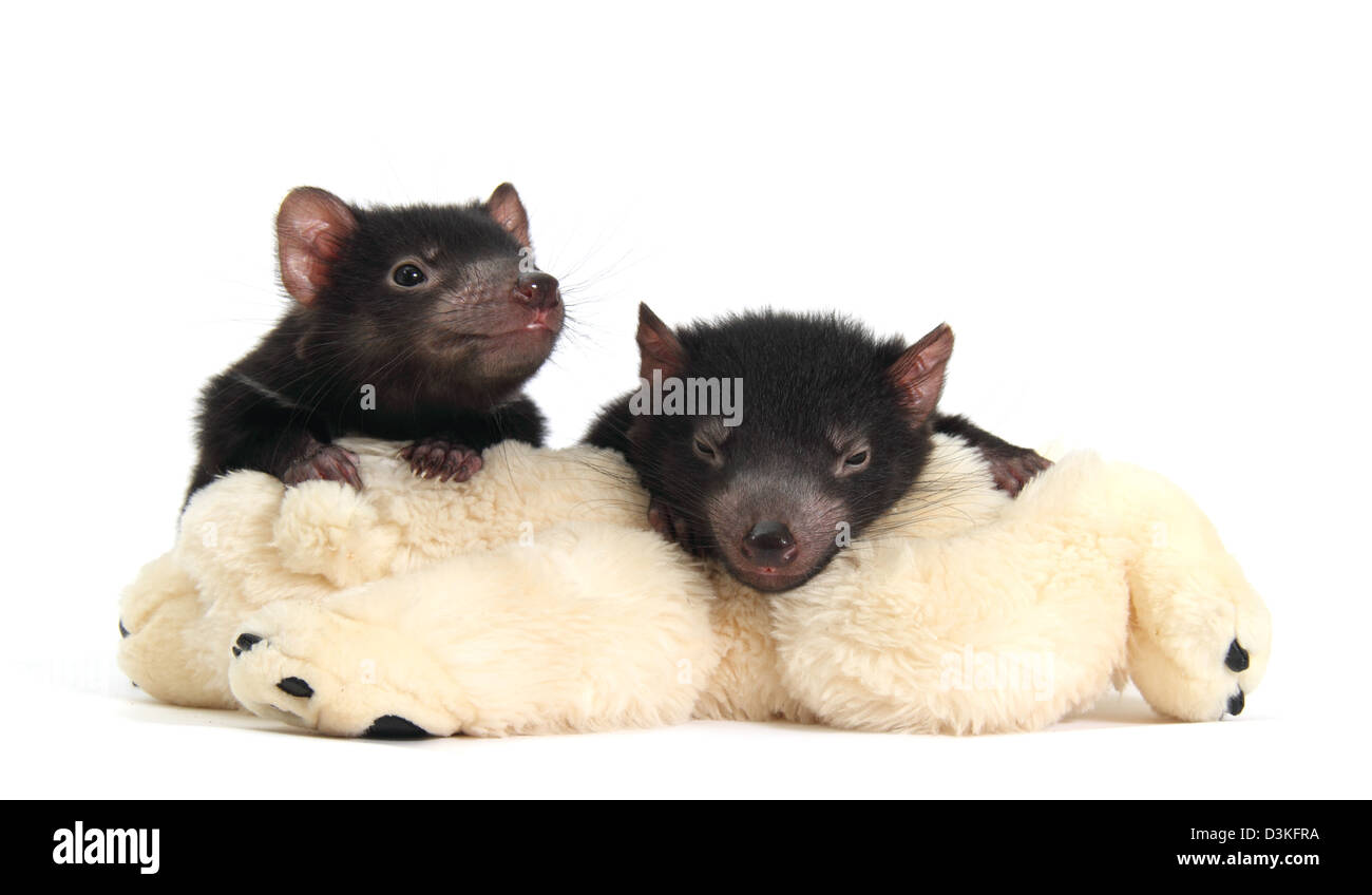Tasmanian Devil Juveniles On A Stuffed Toy Photographed In A Studio Stock Photo Alamy